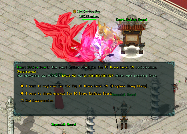 សម្រាប់តួអង្គដែល មានកំរិត Level 99 និង Max Experience មុនគេណាមួយ និង តម្រូវអោយទៅចុះឈ្មោះនៅឯ NPC: Court Notice Board ដែលមានទីតាំងស្ថិតនៅ BianJing 183 / 171 អោយបានមុនគេ ។